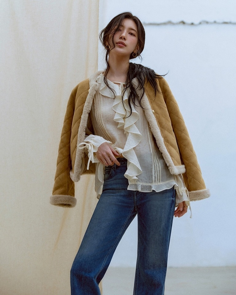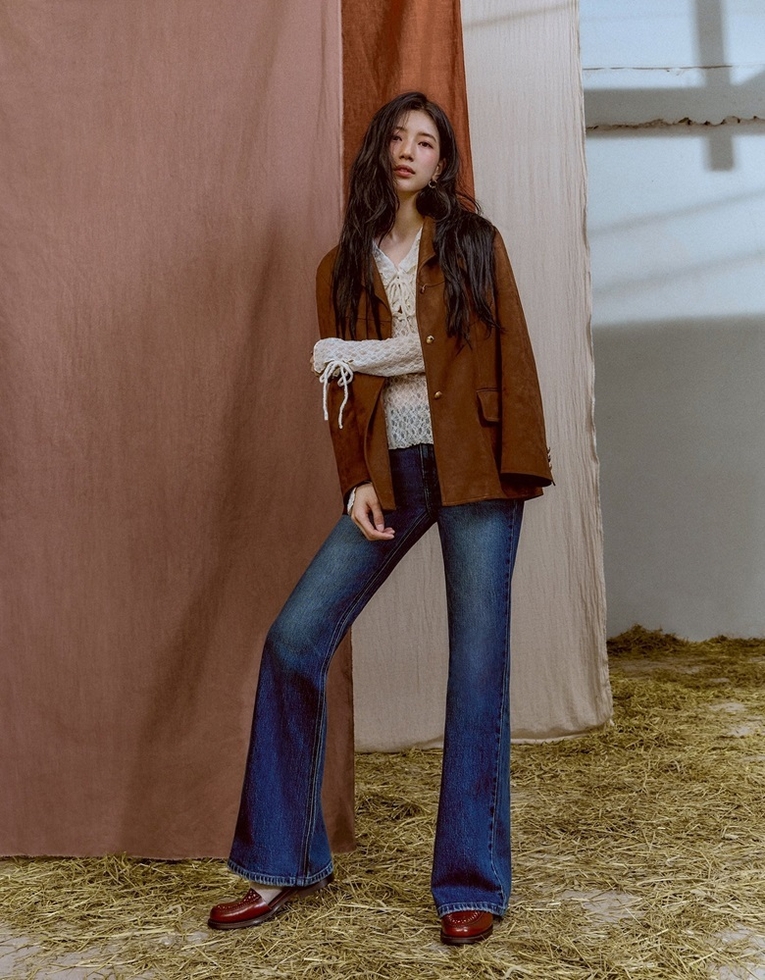 수지는 브라운 톤의 스웨이드 재킷과 프릴 장식이 돋보이는 블라우스, 체크 셔츠 등 보헤미안 감성이 물씬 풍기는 아이템을 매치하며, 70년대의 자유로운 스타일을 현대적인 감각으로 재해석했다. 여기에 게스의 시그니처 아이템인 붓컷 팬츠와 루즈핏 배기 팬츠, 와이드 핏 롤업 팬츠 등 다양한 데님 아이템을 더해 편안하면서도 유니크한 가을 룩을 완성했다.