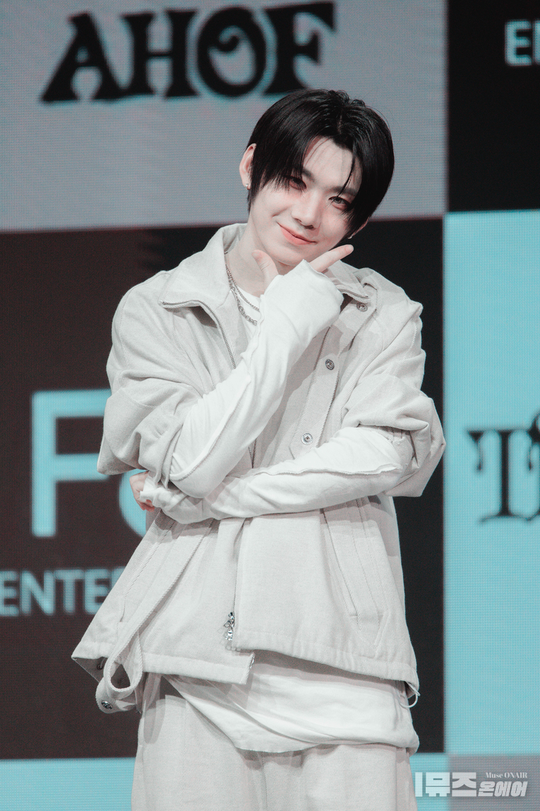 아홉(AHOF)의 박한이 미니 2집 'The Passage' 발매 기념 미디어 쇼케이스 포토타임에 포즈를 취하고 있다.