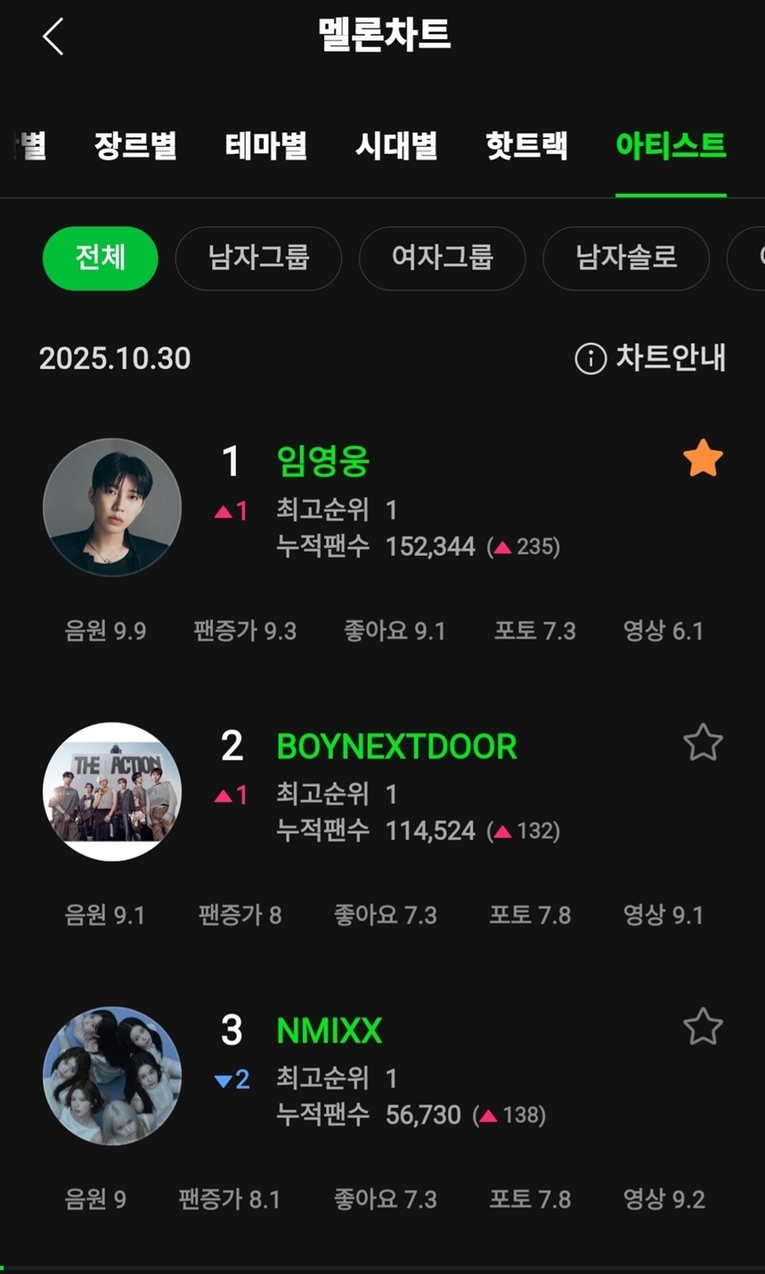 멜론이 발표한 10월 30일 기준 아티스트 차트에서 임영웅은 음원 9.9점, 팬 증가 9.3점, 좋아요 9.1점 등 모든 세부 항목에서 고른 강세를 보이며 종합 1위를 차지했다. 이는 아이돌 그룹 중심의 경쟁 속에서도 솔로 가수로서 압도적인 존재감을 드러낸 결과다. 멜론 측은 하루 단위로 음원 이용자 수, 팬 증가 수, 좋아요, 포토·비디오 감상 수 등을 종합해 점수를 산출하며, 특히 음원 점수에는 4배, 팬 증가에는 2배의 가중치를 부여한다. 이러한 구조 속에서도 임영웅은 전 항목에서 고루 높은 수치를 기록하며 정상을 굳건히 했다.