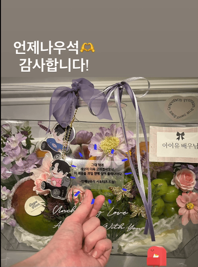 또한 아이유는 이번 사진을 통해 함께 촬영 중인 배우 변우석의 팬들에게 받은 선물을 인증하며 “언제나 우석 감사합니다”라는 손편지 같은 인사를 전했다. 사진 속에는 “그대 덕에 세상이 더욱 고와졌사오니 이 마음을 과일 향에 실어 올리나이다”라는 문구가 적힌 과일 바구니가 놓여 있었다. 팬들의 따뜻한 응원에 화답하듯 손하트를 날리는 그의 모습은 소탈하고 진심 어린 배우의 면모를 엿보게 했다.