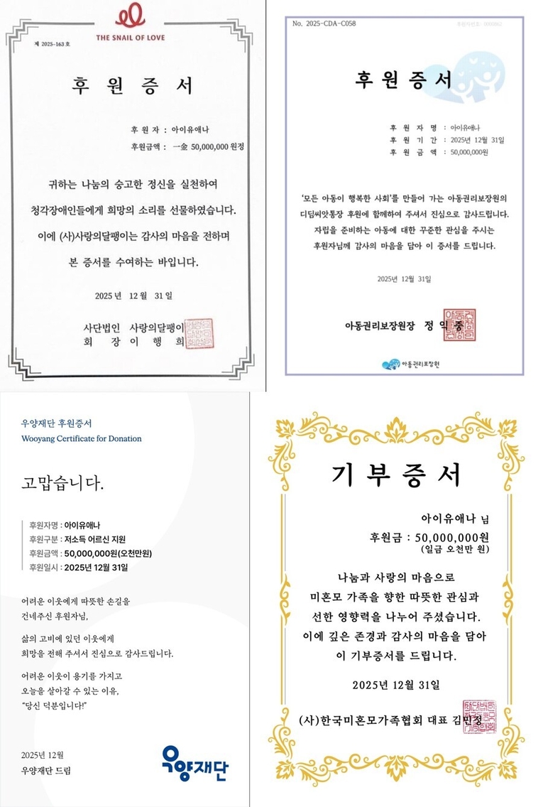 한편, 아이유는 현재 차기작인 MBC 드라마 '21세기 대군부인' 촬영에 한창이다. 그동안 음악과 연기 분야에서 모두 뛰어난 성과를 이루어낸 아이유는 이번 기부를 통해 사회적 기여에도 앞장서며, 팬들에게 더욱 깊은 감동을 선사하고 있다.