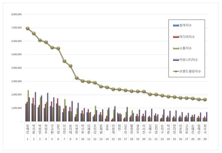 1위에 오른 유해진은 참여지수 1,336,124, 미디어지수 1,470,645, 소통지수 2,344,028, 커뮤니티지수 1,808,402를 기록하며 브랜드평판지수 6,959,199로 집계됐다. 유해진은 특히 소통지수에서 압도적인 수치를 나타내며 대중과의 접점에서 높은 반응을 이끌어냈다.
