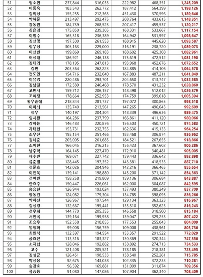 2위를 차지한 박지훈은 참여지수 1,347,782, 미디어지수 1,774,333, 소통지수 1,257,694, 커뮤니티지수 2,209,144를 기록, 브랜드평판지수 6,588,953으로 분석됐다. 박지훈은 커뮤니티지수에서 강점을 보이며 온라인상의 활발한 언급량과 강력한 팬덤 결집력을 입증했다.