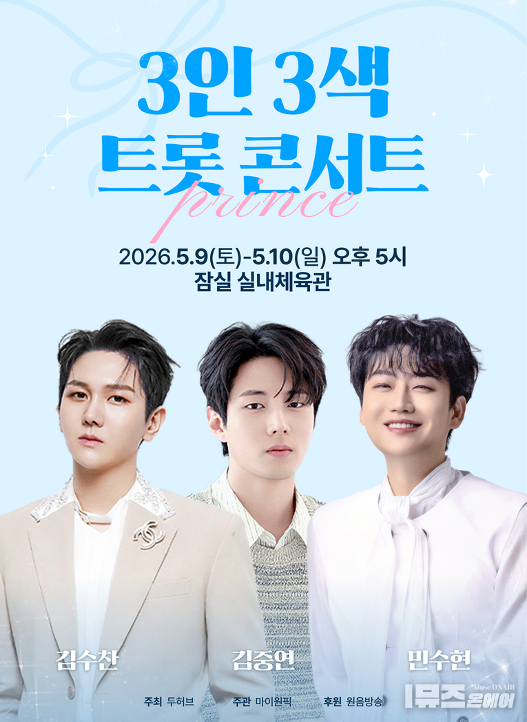 이번 공연은 트로트 장르에서 독보적인 존재감을 드러내고 있는 김수찬, 김중연, 민수현이 주인공으로 나선다. 무대 위에서 넘치는 에너지를 발산하는 김수찬과 흔들림 없는 가창력을 선보이는 김중연, 그리고 깊은 울림을 전하는 민수현까지 각기 다른 음악적 색깔을 지닌 세 명의 아티스트가 한자리에 모여 풍성한 무대를 구성할 예정이다.